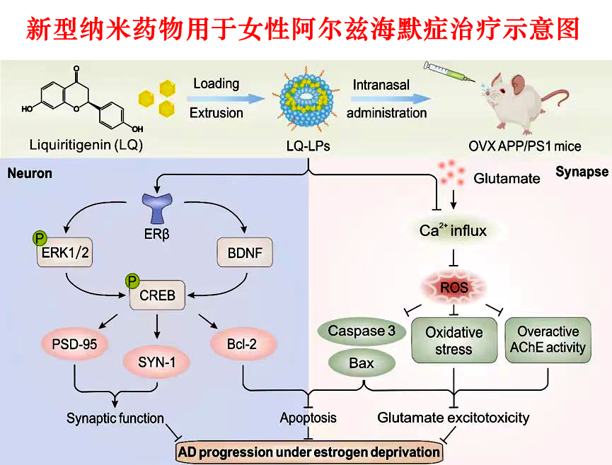 上述成果首次基于植物雌激素甘草素研发了一种多功能纳米药物,实现对绝经后女性阿尔兹海默症的特异性治疗。该纳米药物能够一定程度激活特异性雌激素受体介导的神经保护信号通路,改善雌激素缺失导致的氧化应激、胆碱能异常、神经元损伤和突触功能障碍。