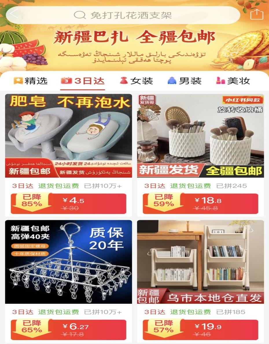 拼多多新疆包邮专题页已开通快递“3日达”极速配送服务