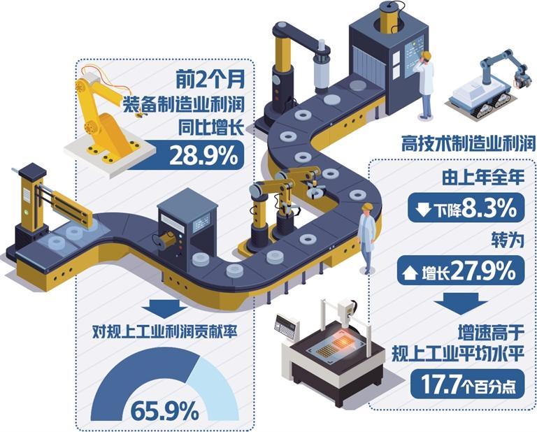 装备制造业、高技术制造业利润明显回升,新质生产力培育壮大。前2个月,装备制造业利润同比增长28.9%,增速比上年全年加快24.8个百分点,拉动规上工业利润增长6.7个百分点,贡献率达65.9%,是贡献最大的行业板块。分行业看,电子行业利润增长2.11倍,铁路船舶航空航天运输设备、汽车、金属制品行业分别增长90.1%、50.1%、27.8%。随着制造业向高端化、智能化、绿色化迈进,高技术制造业利润实现快速增长。前2个月,高技术制造业利润由上年全年下降8.3%转为增长27.9%,增速高于规上工业平均水平17.7个百分点。其中,智能消费设备行业利润增长1.13倍,锂离子电池行业利润增长66.3%,通信终端设备行业由上年同期亏损转为盈利139.7亿元。