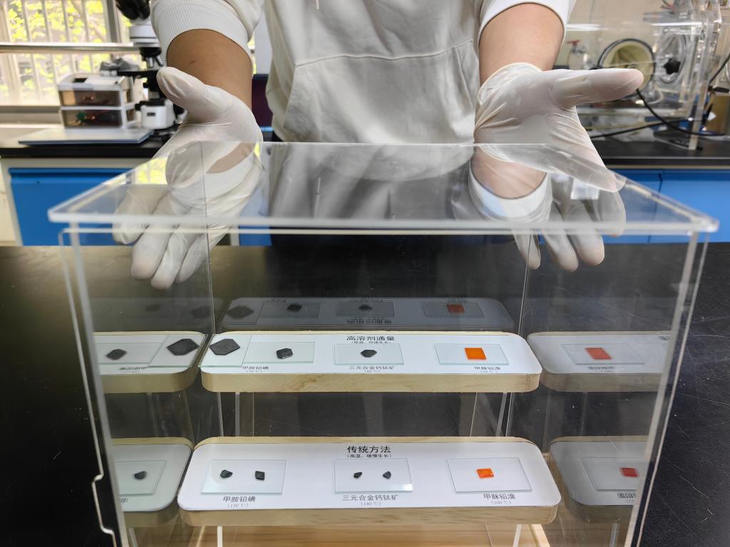 华东理工大学科研人员展示钙钛矿单晶晶片通用生长技术。新华社记者吴振东 摄
