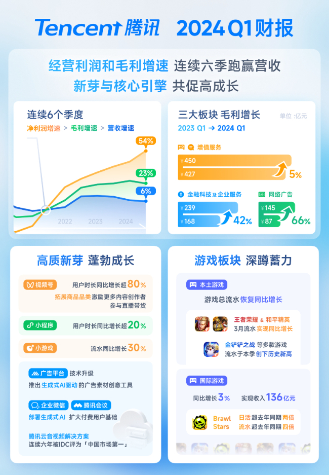 腾讯董事会主席兼首席执行官马化腾表示,一季度公司在本土市场和国际市场的数款头部游戏中的团队调整初见成效,游戏总流水实现增长,为未来几个季度游戏收入恢复增长打下基础。公司持续培育高质量的收入来源,包括微信视频号及搜一搜广告、小游戏平台服务费及视频号商家技术服务费,推动了公司毛利和经营盈利增幅超过收入增幅。公司致力于将盈余资本回馈股东,加大回购力度,按计划执行2024年超千亿港元的股份回购,提升股息,同时致力于持续投资于AI技术、提升平台及生产高价值内容。