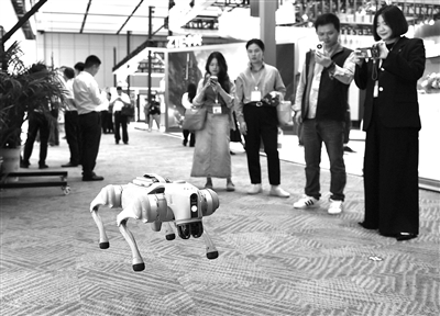 参会人员在2024世界计算大会专题展上观看机器狗的运动演示。