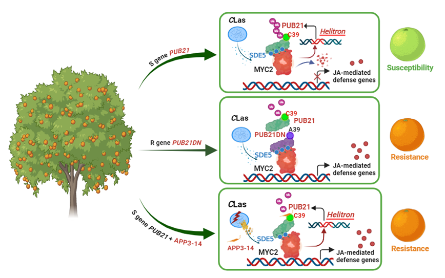 此项研究中,团队系统分析和比较了柑橘“近亲”和“远亲”的遗传信息,并在柑橘“远亲”花椒等植物中发现一种蛋白PUB21DN,它能有效保护“免疫指挥官”MYC2蛋白不被降解,从而持续激活植物的防御系统。