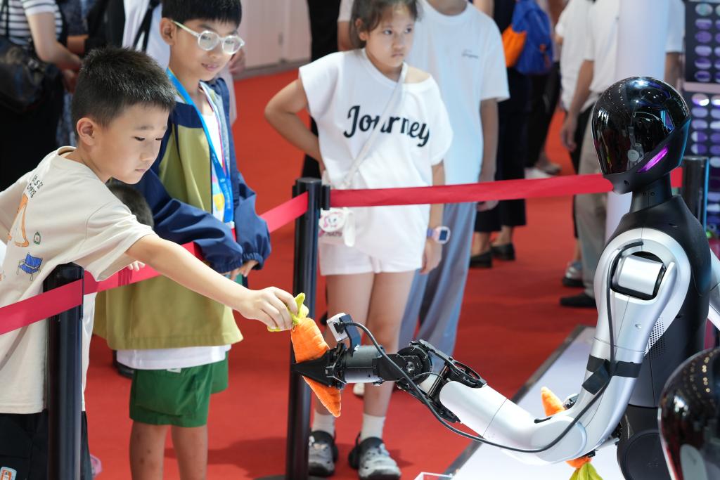 展会上,零次方公司的机器人夹取柔软玩具递到小朋友手中(受访对象供图)