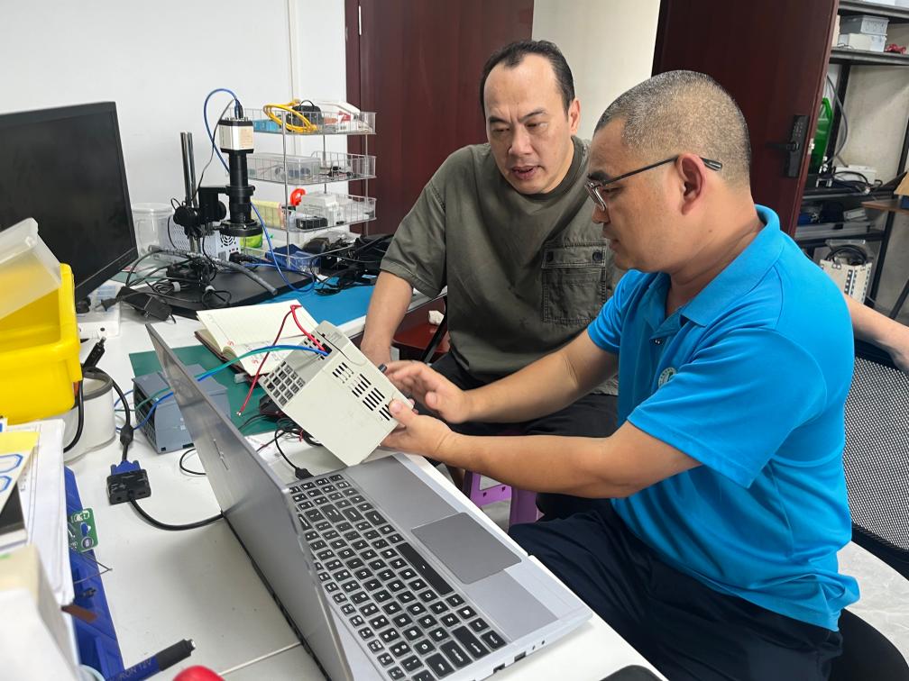 郑勇(右)和梁铭坚在探讨产品研发计划。新华社记者罗江 摄