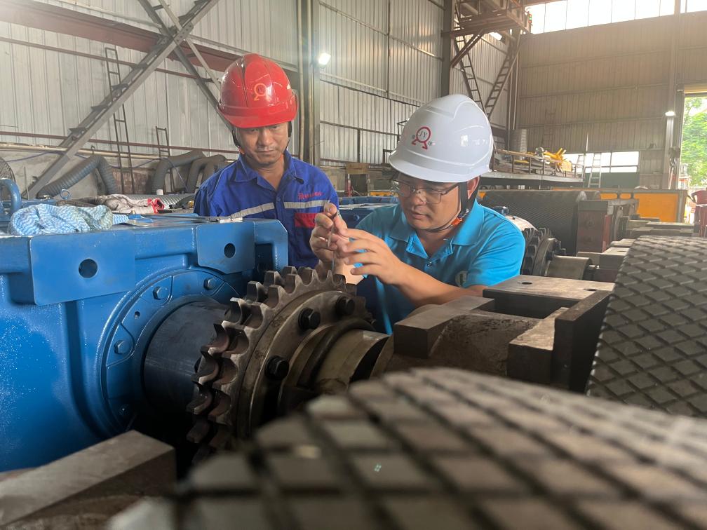 郑勇(右)在车间调试生产设备。新华社记者罗江 摄