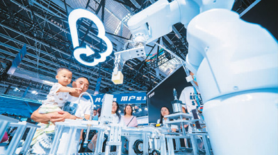 9月6日,2023中国国际数字经济博览会在河北省石家庄市开幕,图为小朋友在博览会上参观工业机器人。