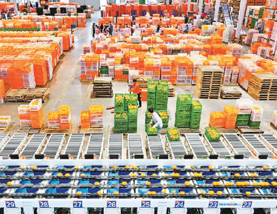 12月16日,在江西省赣州市安远县产城新区的一家采用5G+工业互联网技术的果业加工企业内,工人在智能化生产线上加工包装赣南脐橙。