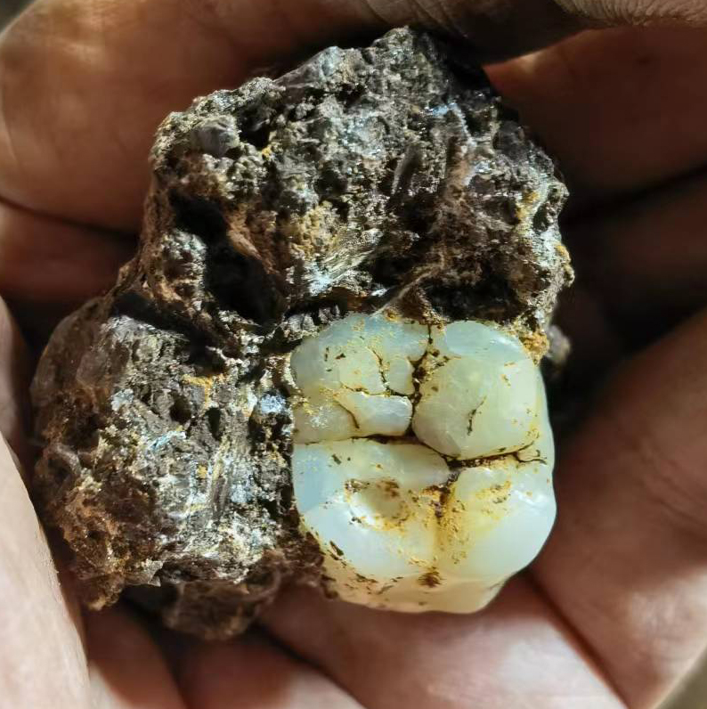 这是科研人员在广西发现的步氏巨猿牙齿化石(资料照片)。新华社发(王伟 摄)